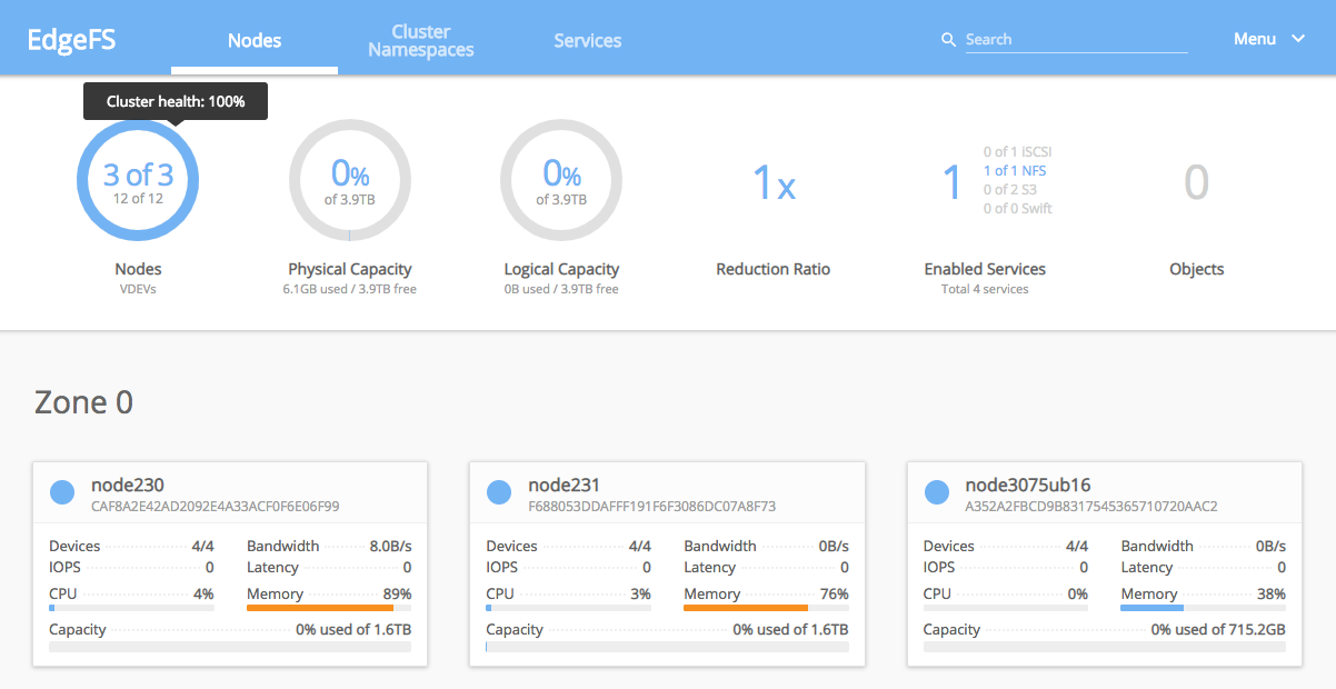 EdgeFS comes with built-in local cluster Dashboard and User Interface.